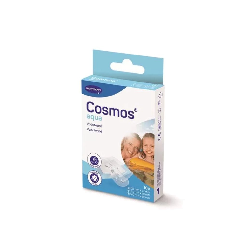 Vodotěsná náplast Cosmos® Aqua od výrobce Hartmann je spolehlivá ochrana drobných ran a odřenin i v nejnáročnějších vodních podmínkách. Průsvitný polyuretanový materiál se dokonale přizpůsobí tvaru těla, neomezuje pohyb a umožňuje průběžnou kontrolu rány bez nutnosti náplast snímat. Jedno balení obsahuje 10 kusů náplastí ve třech různých velikostech.