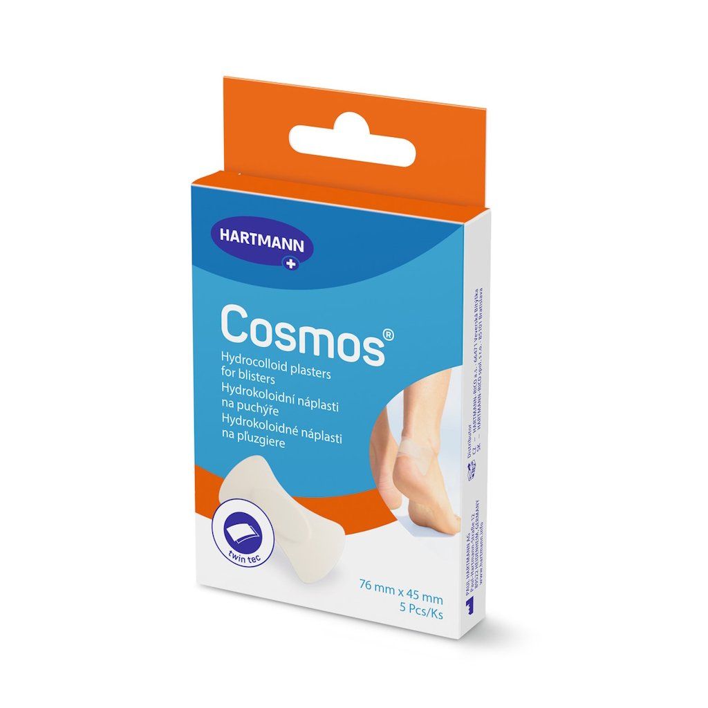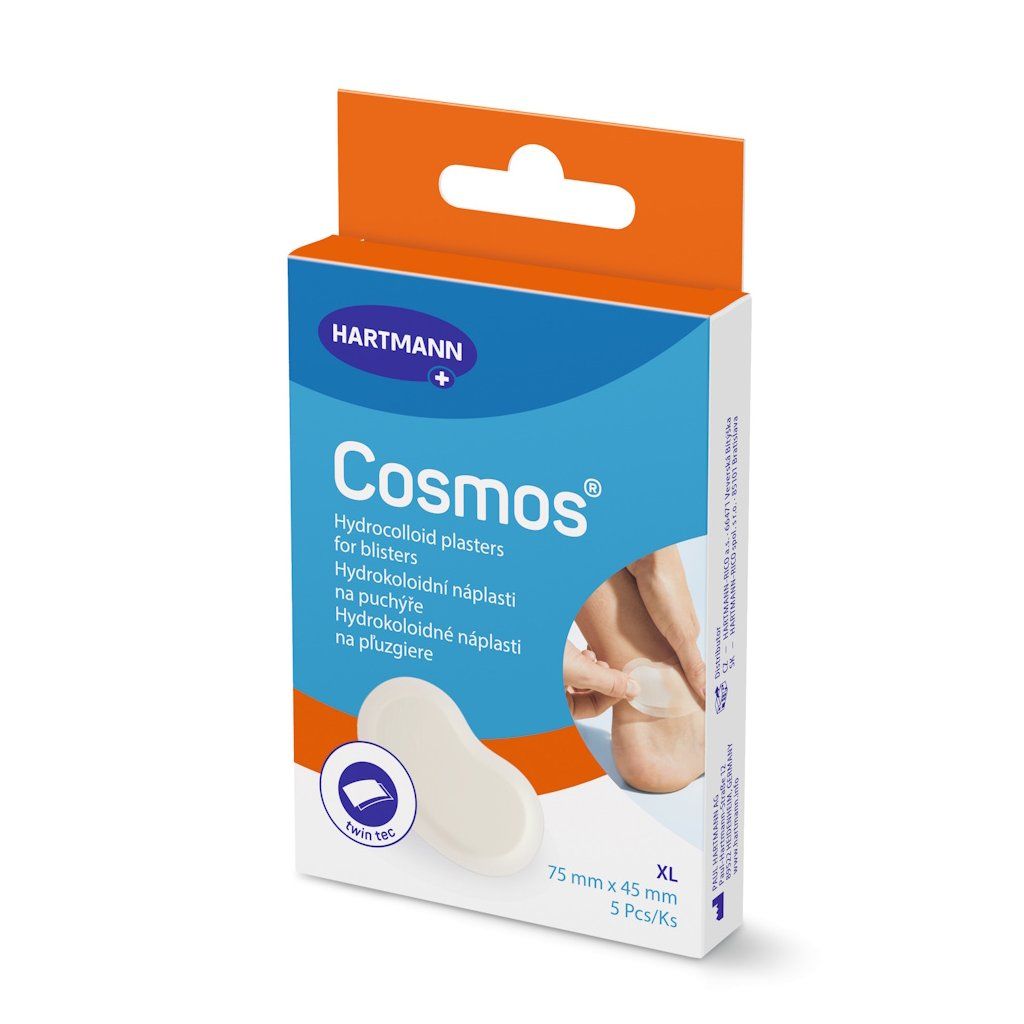 Hydrokoloidní náplast Cosmos® Na puchýře od výrobce PAUL HARTMANN AG je speciální náplast navržená pro léčbu a prevenci puchýřů, kuřích ok, odřenin a popálenin. Oproti klasickým náplastem využívá moderní princip vlhkého hojení – vědecky ověřenou metodu, při níž se kožní buňky hojí lépe a rychleji. Speciální hydrokoloidní polštářek reaguje se sekretem rány a vytváří vlhký ochranný gel, který tlumí bolest, zabraňuje vzniku strupu a chrání puchýř před pronikáním bakterií. Náplast je voděodolná, prodyšná, průhledná a díky speciálnímu tvaru se přizpůsobí místu lepení – působí jako „druhá kůže". Dostupná ve třech variantách pro různé typy a velikosti puchýřů.