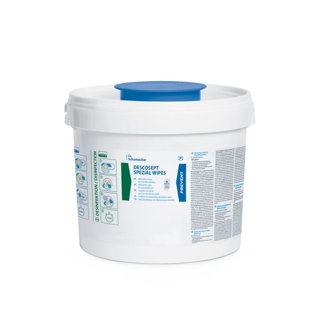 Bezalkoholové dezinfekční utěrky DESCOSEPT SPEZIAL WIPES od výrobce Dr. Schumacher jsou připravené k okamžitému použití pro rychlou dezinfekci a čištění lékařských přístrojů, zdravotnického vybavení i všech typů povrchů v rutinním provozu zdravotnických zařízení. Tyto utěrky jsou ideální pro dezinfekci velkých ploch a nabízejí univerzální a časově úsporné řešení s praktickým dávkovačem. Jsou vyrobeny z netkané textilie. K dispozici je kompletní dávkovač nebo ekonomické náhradní balení.
