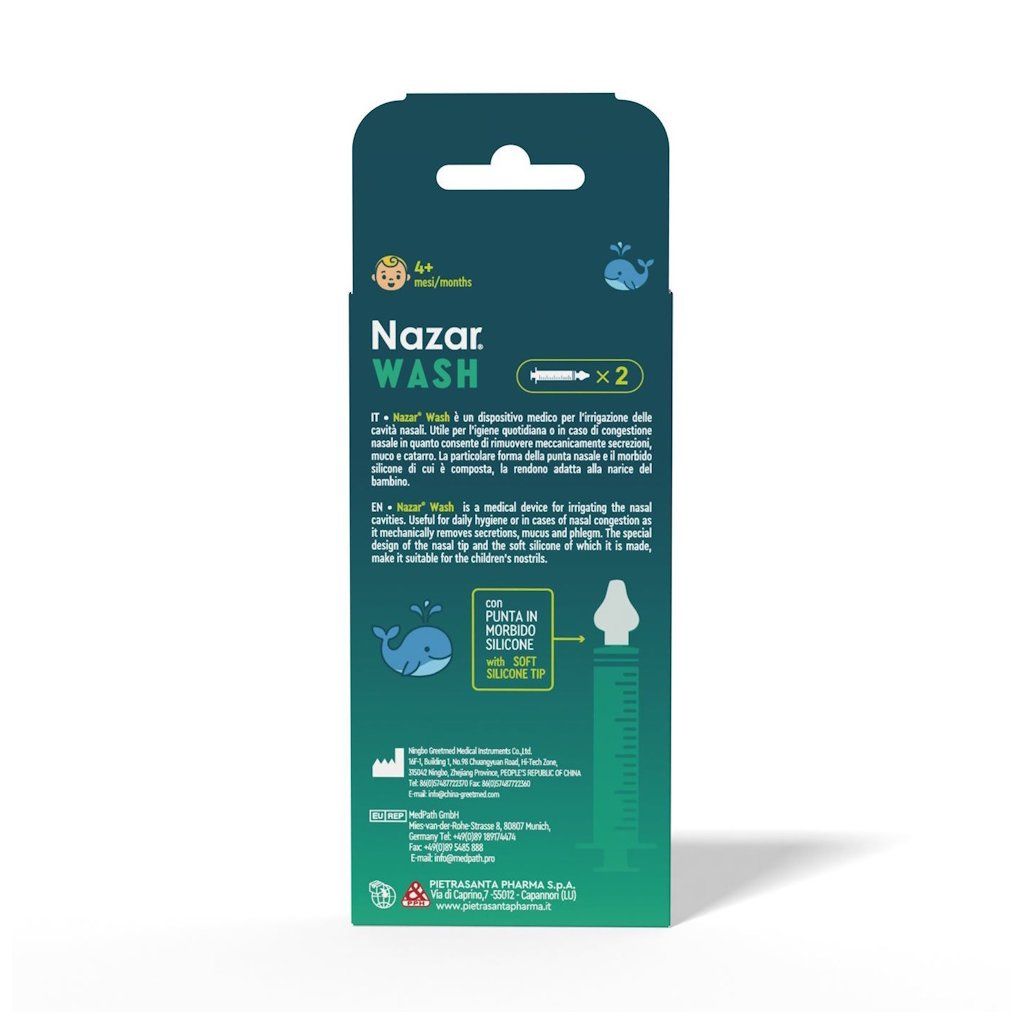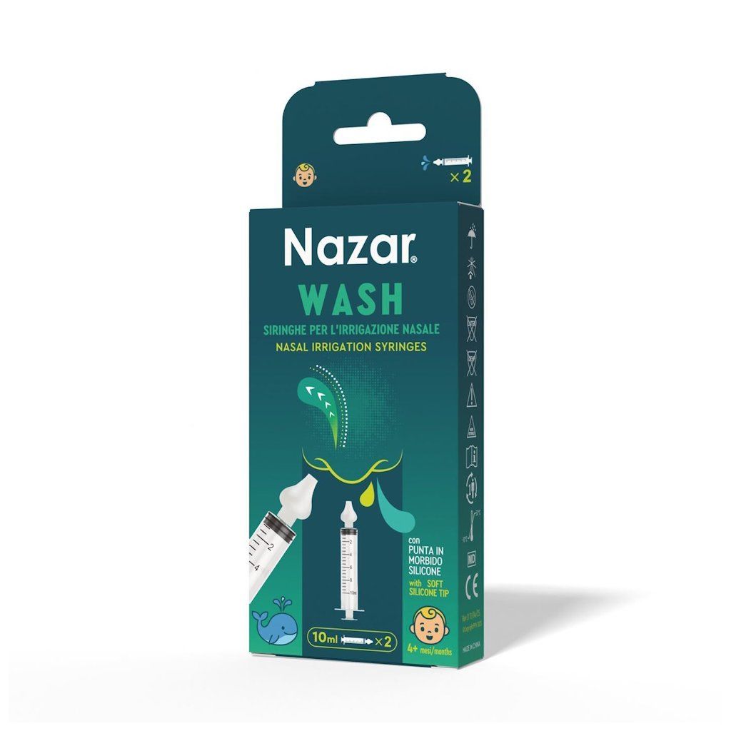 Zdravotnická pomůcka Nazar® Wash od výrobce Pietrasanta Pharma je určena k výplachu nosních dutin. Mechanicky odstraňuje sekrety, hlen a hlenové zátky, čímž uvolňuje ucpaný nos a podporuje přirozené dýchání. Speciální konstrukce silikonové nosní špičky a jemný měkký silikon ji činí vhodnou i pro nejmenší dětské nosní dírky – přípravek je bezpečný od 4 měsíců věku. Balení obsahuje 2 stříkačky po 10 ml. Bez latexu, bez ftalátů.