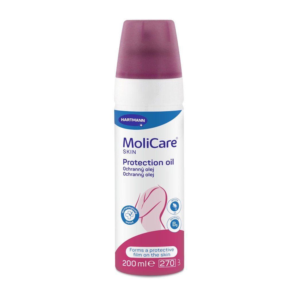 Ochranný olej ve spreji MoliCare® Skin od výrobce PAUL HARTMANN AG je jemný vyživující tělový olej určený pro komplexní péči o citlivou, suchou a inkontinencí namáhanou pokožku celého těla. Obohacené složení s panthenolem a mandlovým olejem poskytuje intenzivní hydrataci, výživu a ochranu pokožky, která je každodenně vystavena zvýšenému namáhání. Zároveň zklidňuje neporušenou pokožku v okolí ran. Praktické balení ve spreji zajišťuje rychlou, hygienickou a rovnoměrnou aplikaci bez nutnosti přímého kontaktu s pokožkou – ideální pro péči o pacienty v domácím i profesionálním prostředí. Přípravek je kompatibilní s absorpčními inkontinenčními pomůckami MoliCare®.