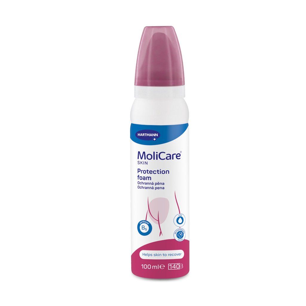 Ochranná pěna MoliCare® Skin od výrobce PAUL HARTMANN AG je lehká dermatologicky testovaná pěna určená k ochraně a regeneraci citlivé, podrážděné nebo inkontinencí namáhané pokožky. Jako praktická alternativa k bariérovému krému se snadno roztírá a vytváří účinnou ochrannou vrstvu již při malém množství. pH-vyvážené složení s ureu, panthenolem B5 a mandlovým olejem podporuje přirozenou ochrannou funkci pokožky a přináší zklidnění i v nejnamáhanějších oblastech. Přípravek neobsahuje oxid zinečnatý a je plně kompatibilní s absorpčními inkontinenčními pomůckami MoliCare® – jejich savost zůstává zcela zachována.